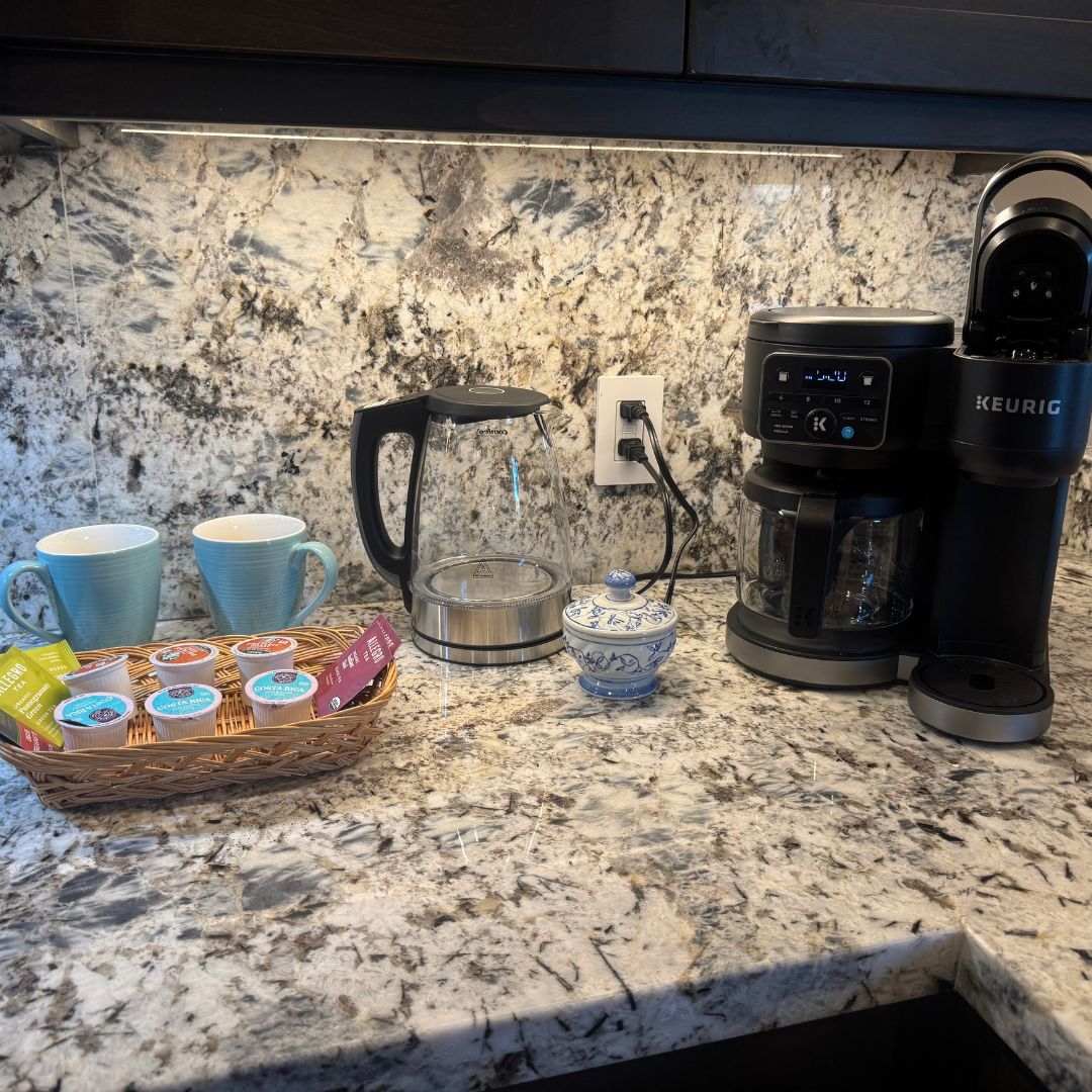 Essentials: Keurig coffee machine, kettle with temperature settings, full refrigerator with water and ice dispenser, and dishwasher.